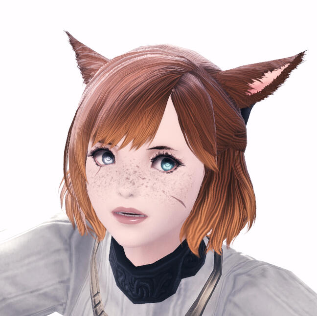 Tamsyn has extensive scarring across her body from several lifetimes of experimental procedures and battles inflicted upon her by her Garlean captors. The most notable of these are on the left side of her face. Her eye has been replaced or severely altered, resulting in a scar around the eye. More scars run across her cheek, nose, and lip.Before her escape, Tamsyn was only outside on a few occasions, and was fully covered when she was taken outdoors. As a result, she has a rather unhealthy pallor. She's started developing freckles across her cheeks, nose, and shoulders as she spends more time in the light of day.Tamsyn's ear and tail have fur that's a bit longer than a typical shorthair Mi'qote, with a slightly wavy texture.